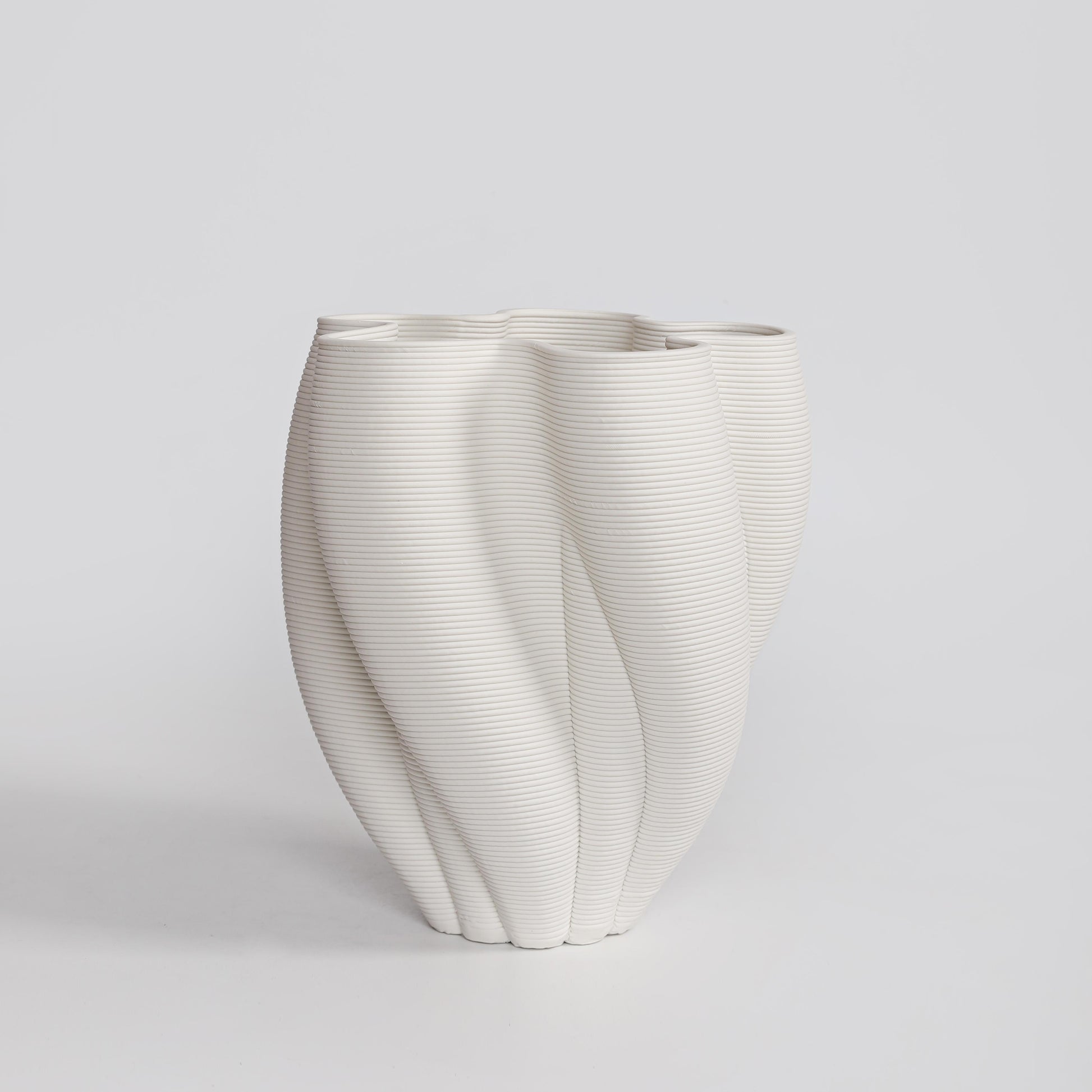 This white vase has a soft, sculptural shape with gentle twists that give it a relaxed, modern feel. The fine layered texture adds interest without being too much. It’s an easy piece to style—looks great on its own or with a few simple stems. Works beautifully in calm, light-filled spaces.